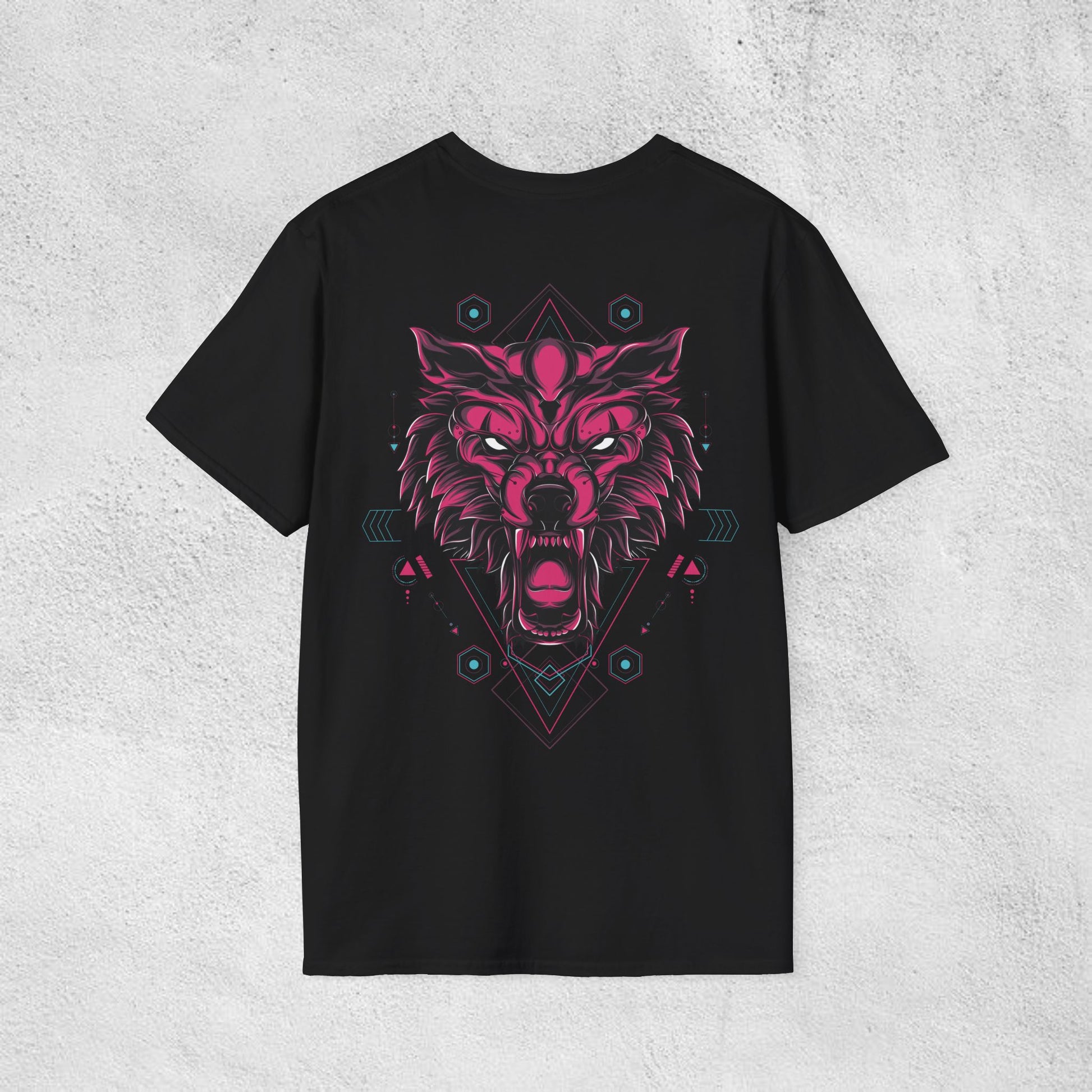 The APEX Wolf T-Shirt channels cyber dominance through neon intensity. Featuring a razor-sharp wolf framed in geometric tech glyphs and electric pink energy, this design blends primal instinct with digital precision. The symmetrical layout and glowing accents feel like a HUD overlay for a predator in hunt mode.